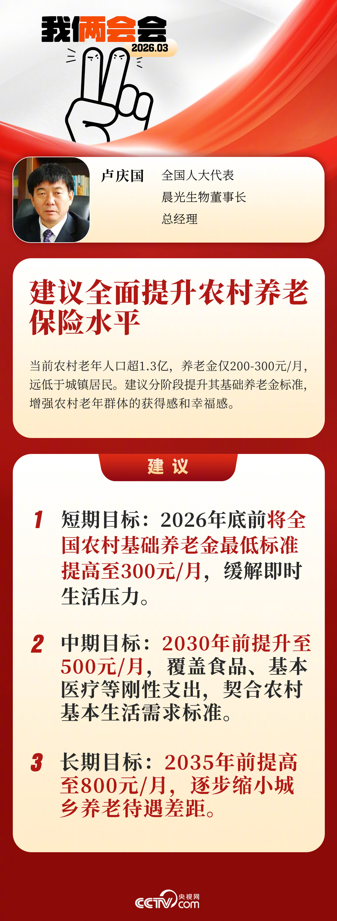 全国人大代表卢庆国建议全面提升农村养老保险水平。他指出,当前农村老年人口超1.3亿,养老金仅约200-300元/月,远低于城镇居民。建议分阶段提升农村老人基础养老金:短期目标,在2026年前提升至300元/月,中期目标,在2030年前提升至500元/月,长期目标,在2035年前提升至800元/月,以缩小城乡居民养老金差距,增强农民获得感与幸福感。